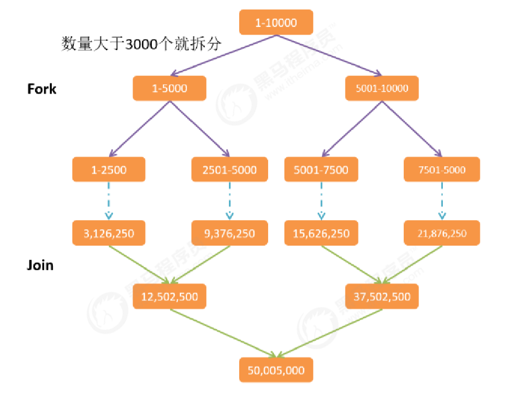 - 需求:使用Fork/Join计算1-10000的和,当一个任务的计算数量大于3000时拆分任务,数量小于3000时计算。