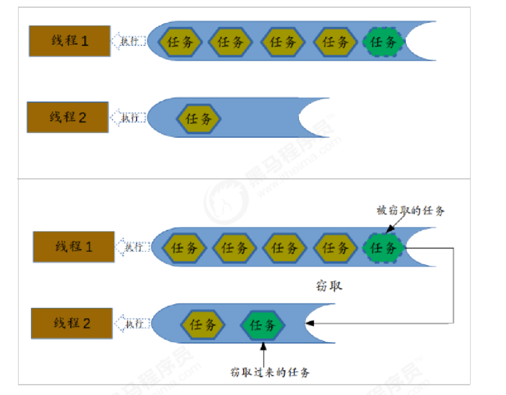 那么为什么需要使用工作窃取算法呢?假如我们需要做一个比较大的任务,我们可以把这个任务分割为若干互不依赖的子任务,为了减少线程间的竞争,于是把这些子任务分别放到不同的队列里,并为每个队列创建一个单独的线程来执行队列里的任务,线程和队列一一对应,比如A线程负责处理A队列里的任务。但是有的线程会先把自己队列里的 任务干完,而其他线程对应的队列里还有任务等待处理。干完活的线程与其等着,不如去帮其他线程干活,于是它就去其他线程的队列里窃取一个任务来执行。而在这时它们会访问同一个队列,所以为了减少窃取任务线程和被窃取任 务线程之间的竞争,通常会使用双端队列,被窃取任务线程永远从双端队列的头部拿任务执行,而窃取任务的线程永 远从双端队列的尾部拿任务执行。